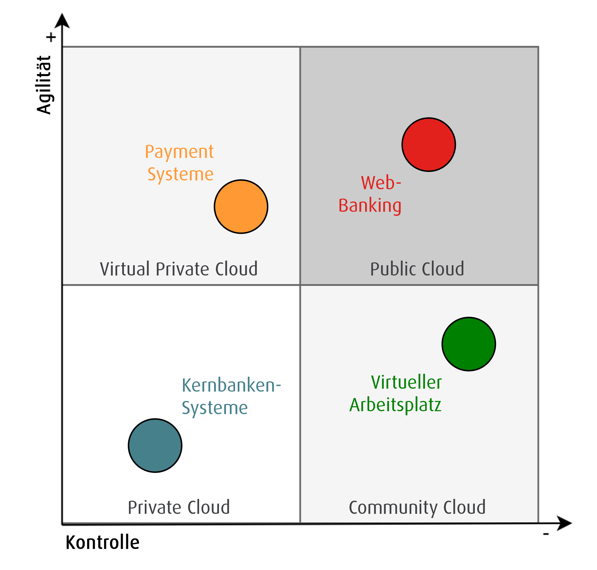 Während die Public Cloud bei Arbeitsplatzlösungen Einzug hält, verbleiben geschäftskritische Systeme wie Kernbankenapplikationen oder E-Banking weiterhin in kontrollierten Umgebungen. Aktuell betreiben Schweizer Banken etwas weniger als die Hälfte ihrer kritischen Workloads in eigenen Rechenzentren, die andere Hälfte wurde auf Private und Community Clouds verlagert.